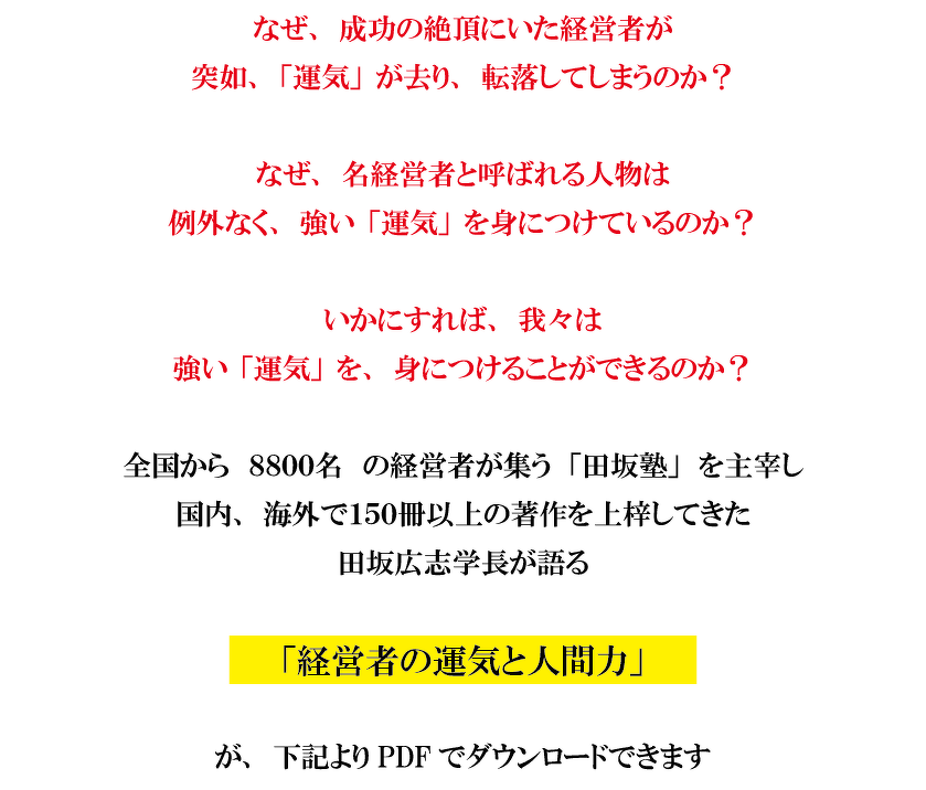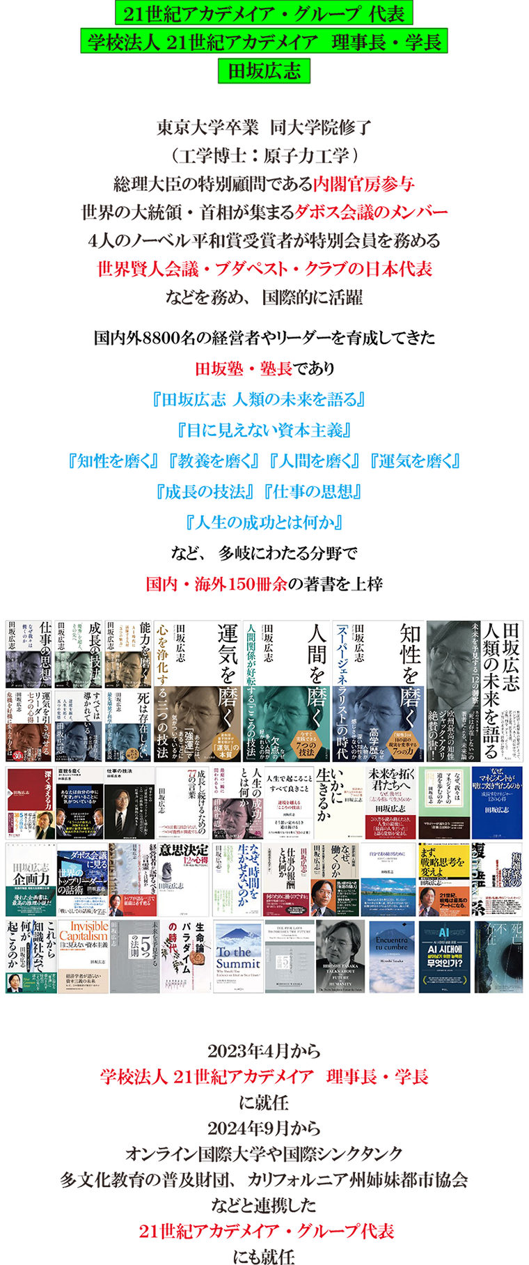 全学科共通 2025年10月01日水 LINEで友だちに送る Twitterでシェアする Facebookでシェアする 田坂広志学長の最新論考 「経営者の運気と人間力」 がForbes JAPANに掲載。経営者やリーダーに求められる究極の力、「運気を引き寄せる力」とは何か、を語りました。 最新論考はこちらからご覧いただけます メールはこちらへ 全文はこちら(PDF) 田坂広志アカデメイア 公式HP 学校法人 21世紀アカデメイア 公式HP メールはこちらへ 問い合わせはこちらのフォームから