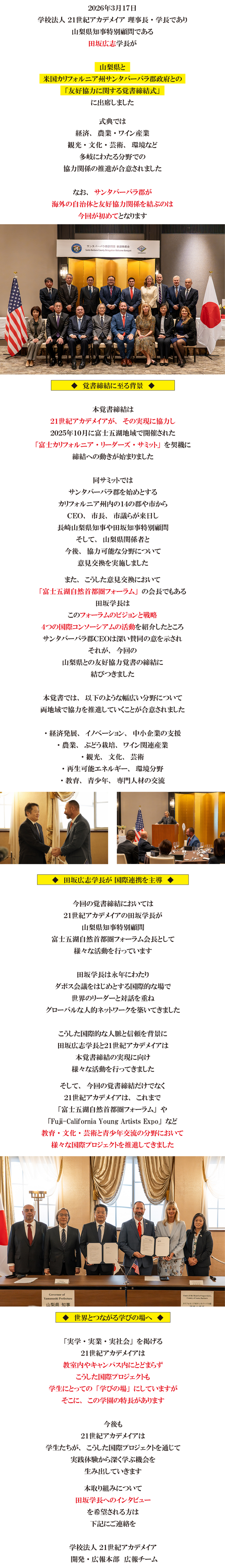 全学科共通 2026年04月03日金 山梨県と米国サンタバーバラ郡が友好協力覚書を締結。21世紀アカデメイアが、この国際連携を推進。同郡初の海外提携 メールはこちらへ 学校法人 21世紀アカデメイア 公式HP メールはこちらへ 問い合わせはこちらのフォームから