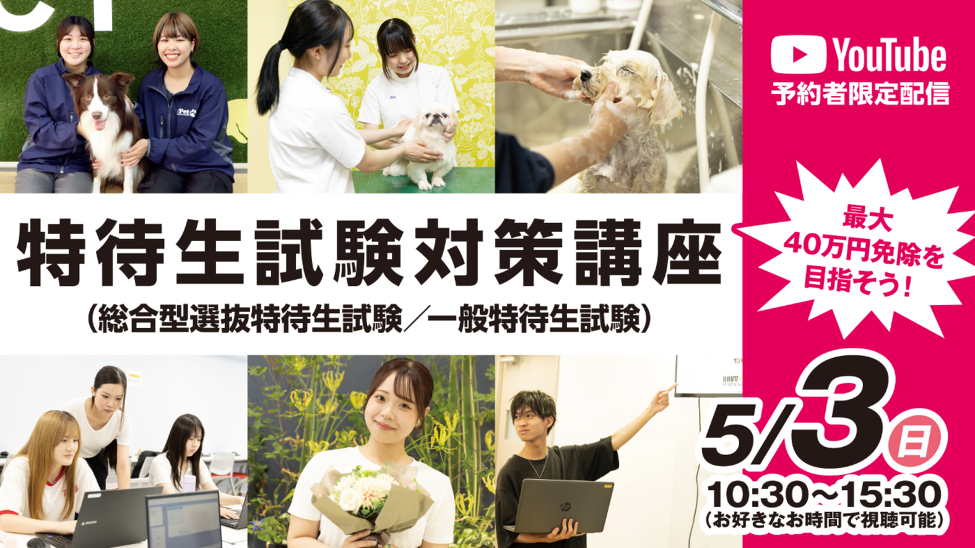 開講日 05月03日日 スペシャルイベント 【オンライン】高校3年生限定!特待生試験対策講座(総合型選抜特待生試験/一般特待生試験) 【予約者限定/オープンキャンパス参加歴がある方限定】 視聴可能時間 10:30〜15:30(30分程度、お好きな時間に視聴可能) 総合型選抜特待生や一般特待生の試験を受験される方対象の特待生試験対策講座です! 最大40万円免除を目指そう! おうちにいながら特待生試験対策講座(総合型選抜特待生試験/一般特待生試験)を受けることができる オンライン講座になります。